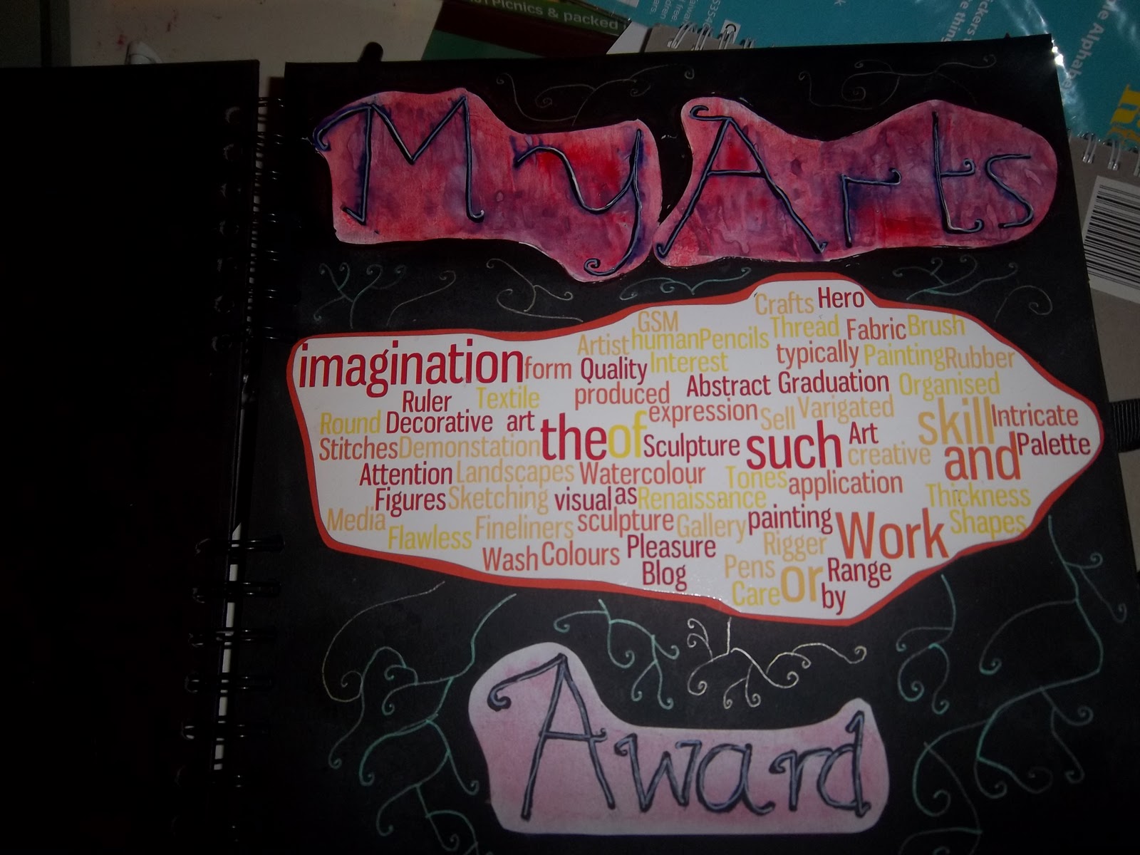 This is my front cover of my arts award. To create the cover, it involved many different parts to it. First, I used a pink pastel in various places across the front page then I fixed the pastel using hairspray. This gave the black a varied shade to the cover. Then I created my own art wordle. I did this on http://www.wordle.com/. The wordle involves as many words as I could have thought of related to art. Then on a white piece of card I used a red pastel to create the pink and red shades on the lettering. I then fixed this to the card through the same method.Next, using acrylic paints I added purple areas to the darkest peice of paper. I then wrote the title, "My Arts Award" and cut the words out individually. I also, once the ink had dried went over the titles in a white pen so through the middle of each letter was a white line. I found that this helped the title stand out. I then glued each peice onto the cover. As I did this I mounted the wordle on orange card as it made it stand out more. It also managed to capture the overall colour scheme of the wordle. Once everything was glued on I used metallic pens to doodle around the edge, the doodling had to try and mimic the motion of leaves.
